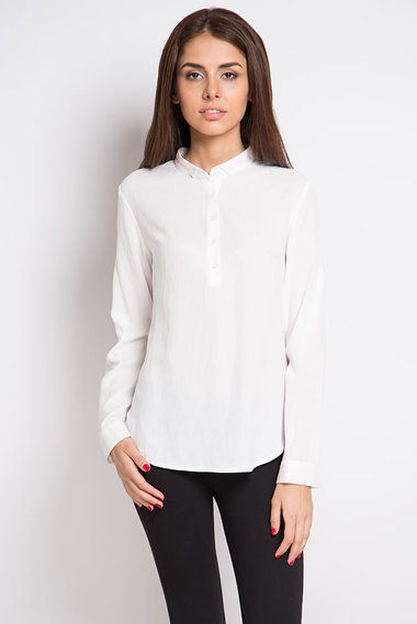 Белая блуза из 100% хлопка. Модель с длинным рукавом, Который можно регулировать с помощью пуговицы. Впереди планка на пять пуговиц.